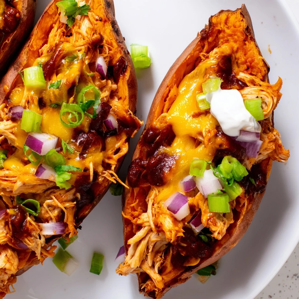 These loaded sweet potatoes combine the natural sweetness of roasted tubers with savory, smoky BBQ chicken and melted cheddar. The dish balances tender vegetables with protein-rich shredded chicken, creating a wholesome and filling meal that's both simple to prepare and deeply satisfying.