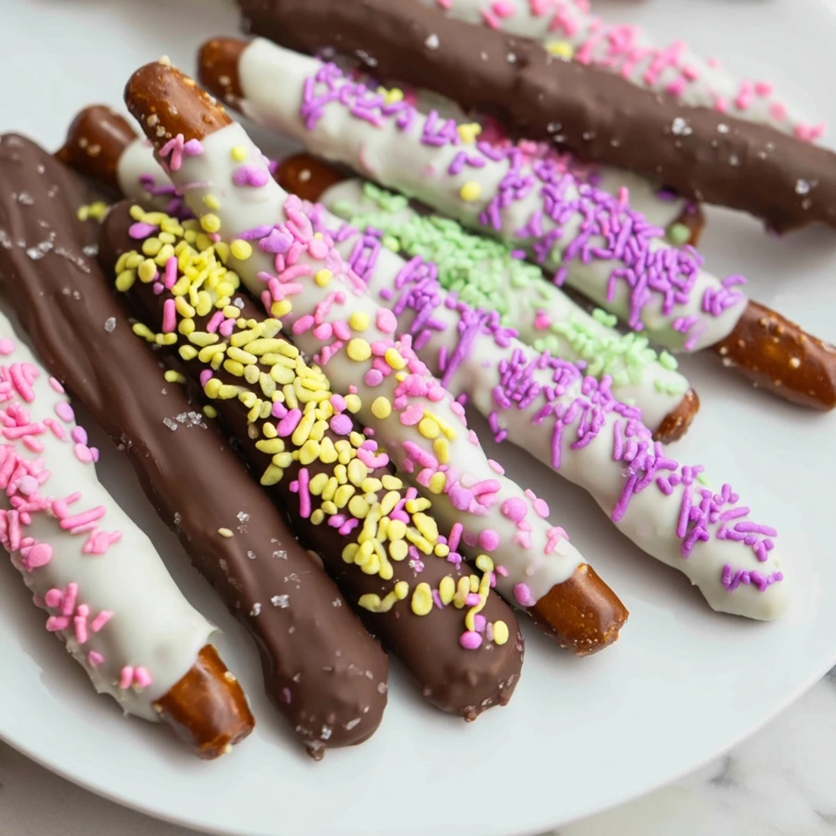 Transform simple pretzel rods into festive Easter treats by dipping them in melted semi-sweet or white chocolate. The combination of salty crunch and smooth chocolate creates irresistible flavors, while colorful sprinkles add joyful holiday flair. These come together in just 25 minutes and stay fresh for up to a week.