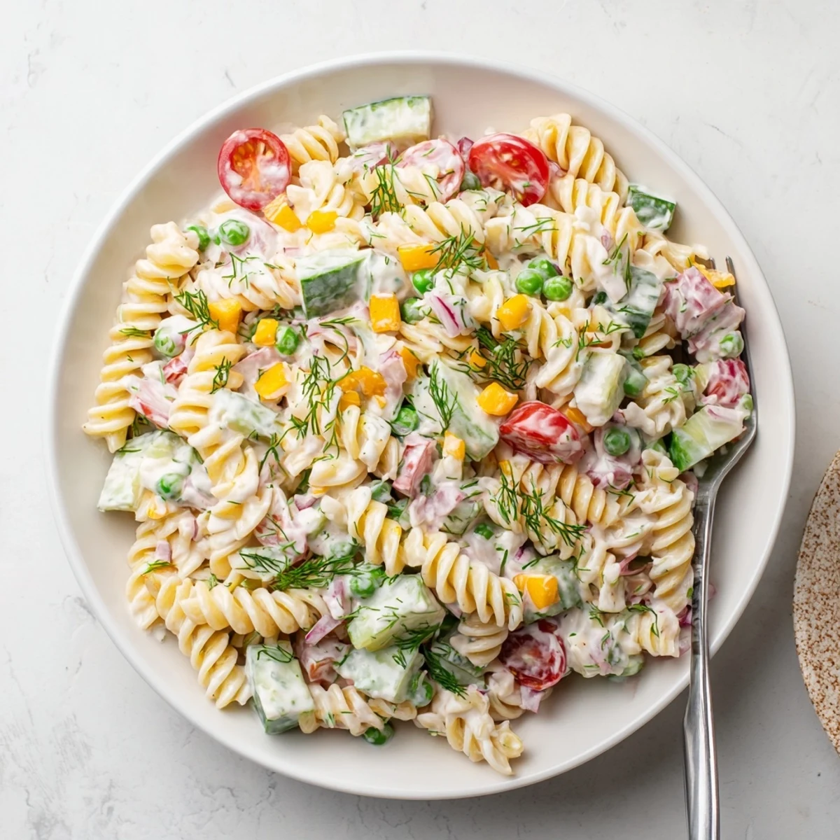 Short pasta shapes like rotini, penne, or fusilli work wonderfully because they hold the creamy dressing well. The ridges and curves help capture the ranch coating and vegetables in every bite.