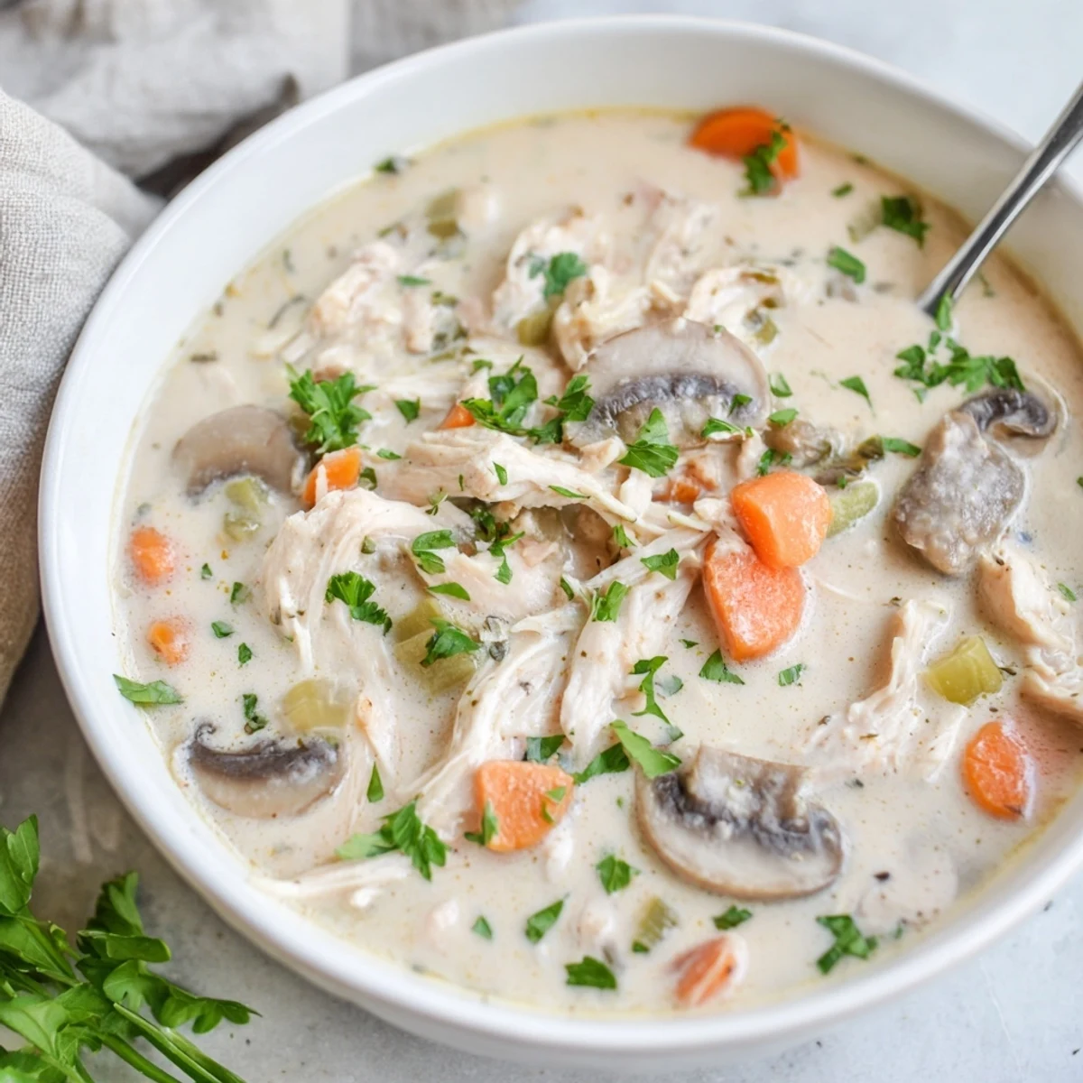 This hearty soup combines shredded rotisserie chicken with sautéed mushrooms, onions, celery, and carrots in a luxurious cream-based broth. The earthy mushrooms complement the tender chicken beautifully, while thyme, parsley, and a hint of nutmeg add depth. Ready in just 40 minutes, this comforting bowl delivers restaurant-quality flavor with minimal effort.