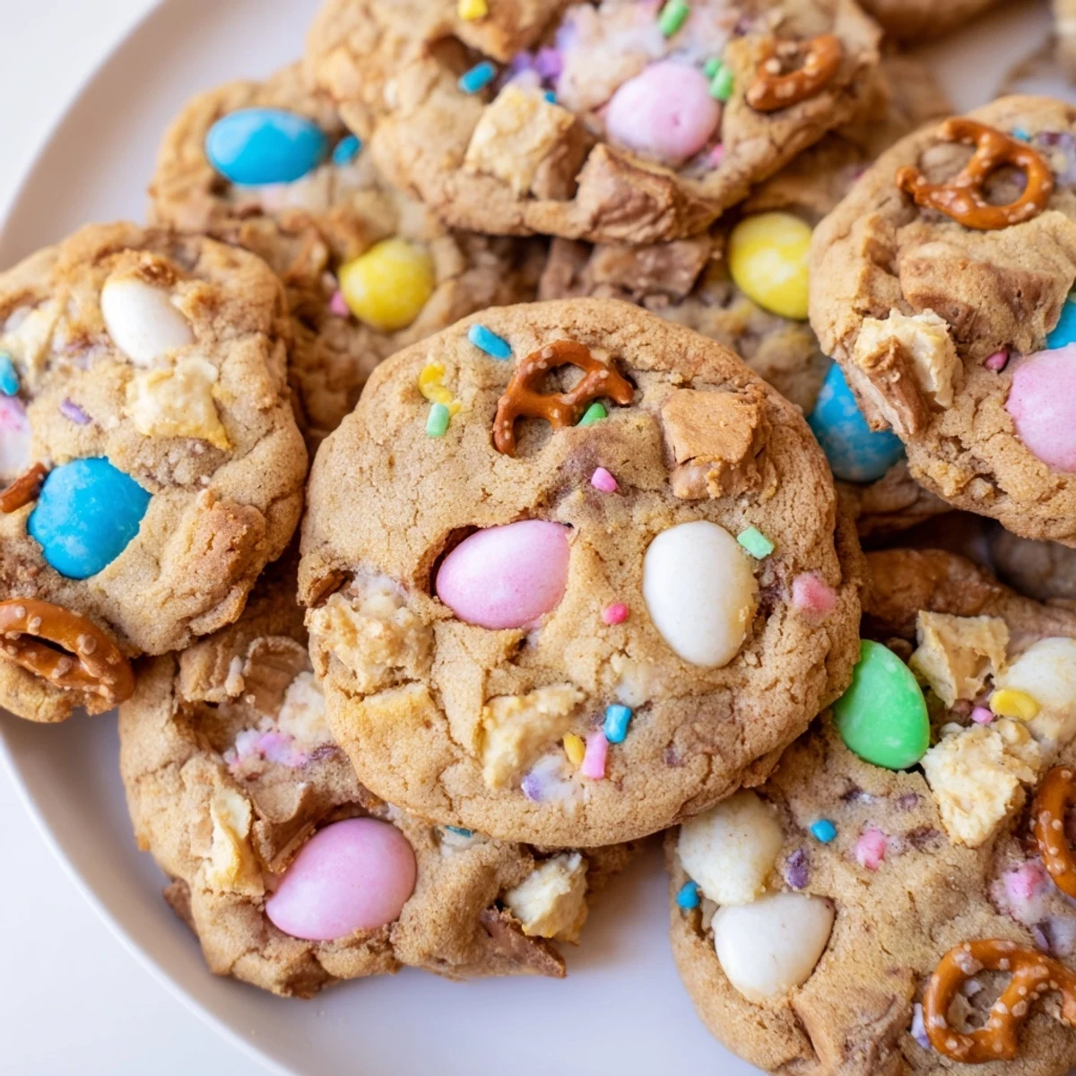 These festive cookies combine the best of both worlds—sweet and salty flavors in every bite. The dough starts with a classic buttery base, then gets loaded with pastel candy-coated chocolates, crunchy pretzel pieces, crispy rice cereal, white chocolate chips, and fluffy mini marshmallows. Each cookie offers a delightful mix of textures and flavors that make them perfect for spring celebrations.
