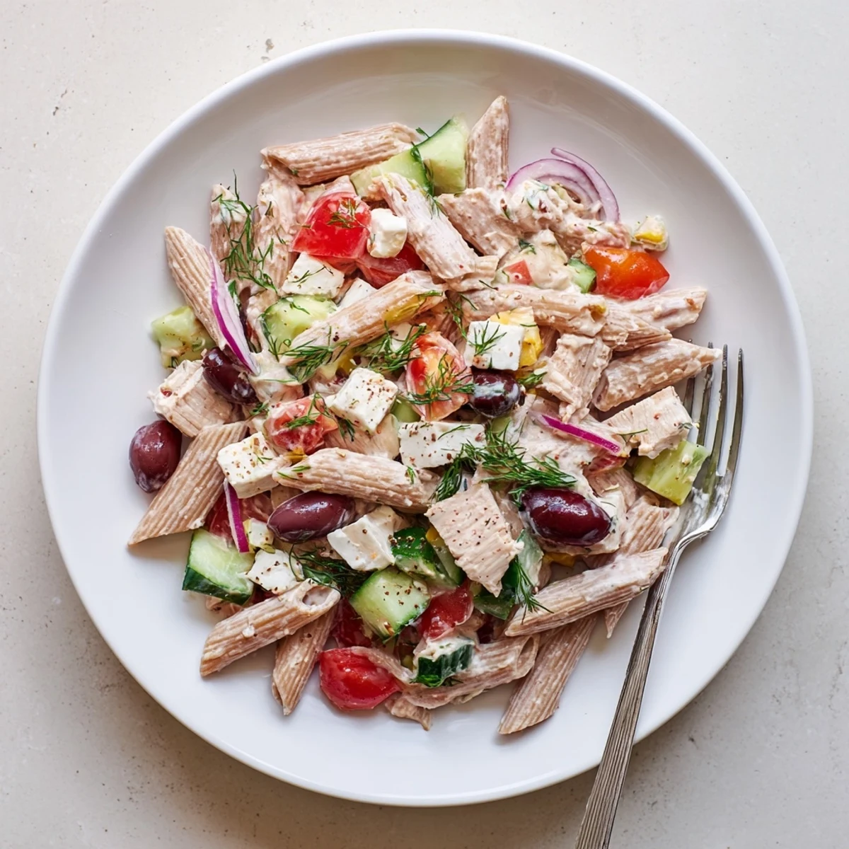 This Mediterranean-inspired salad combines whole wheat pasta with tender chicken, tangy feta, and crisp vegetables like cucumber, cherry tomatoes, and bell peppers. The creamy Greek yogurt dressing with lemon, garlic, and oregano brings everything together beautifully.