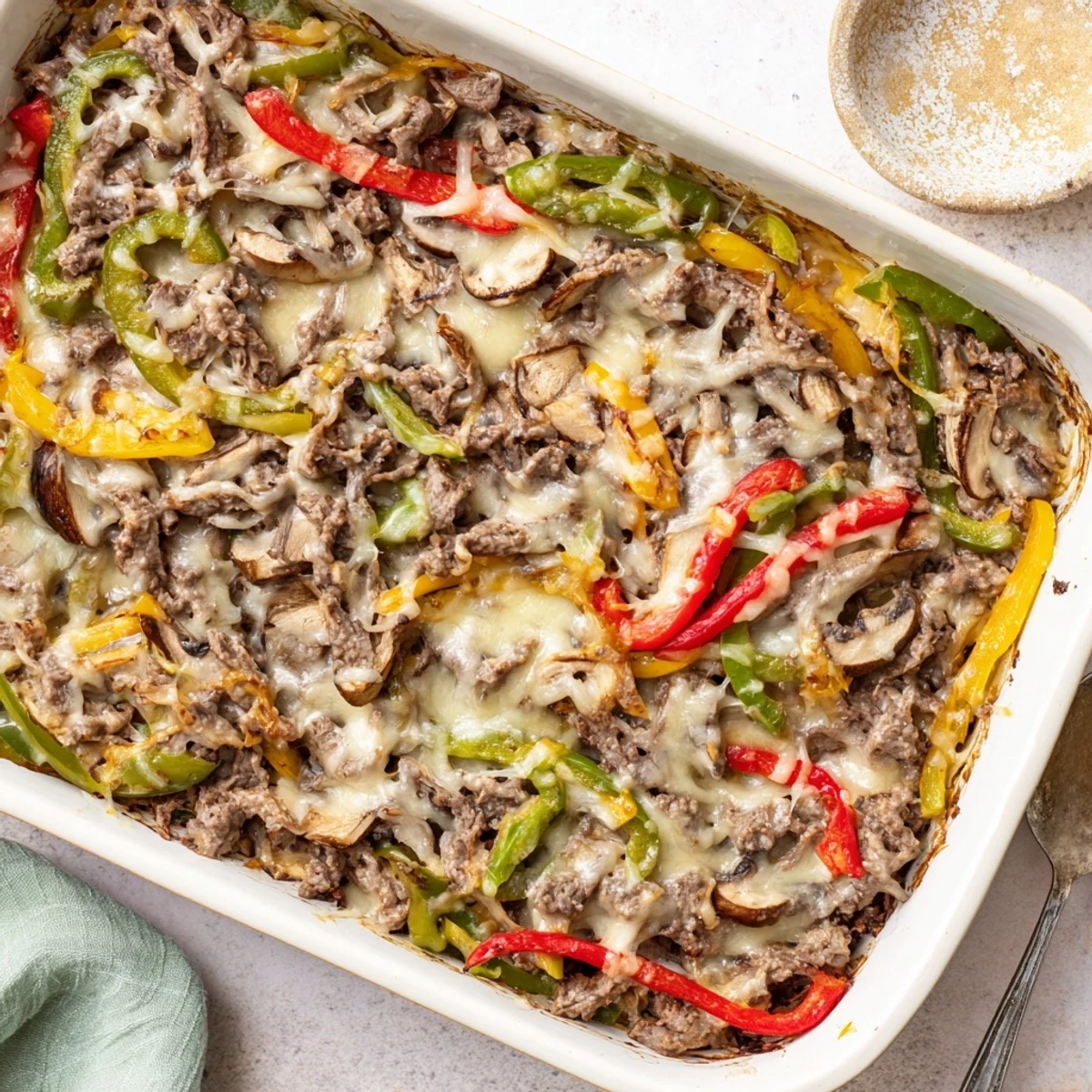 This hearty casserole captures all the classic flavors of a Philadelphia cheesesteak while keeping carbohydrates minimal. Thinly sliced beef sirloin or ribeye gets seasoned and browned to perfection, then combined with sautéed bell peppers, onions, and mushrooms in a creamy base.