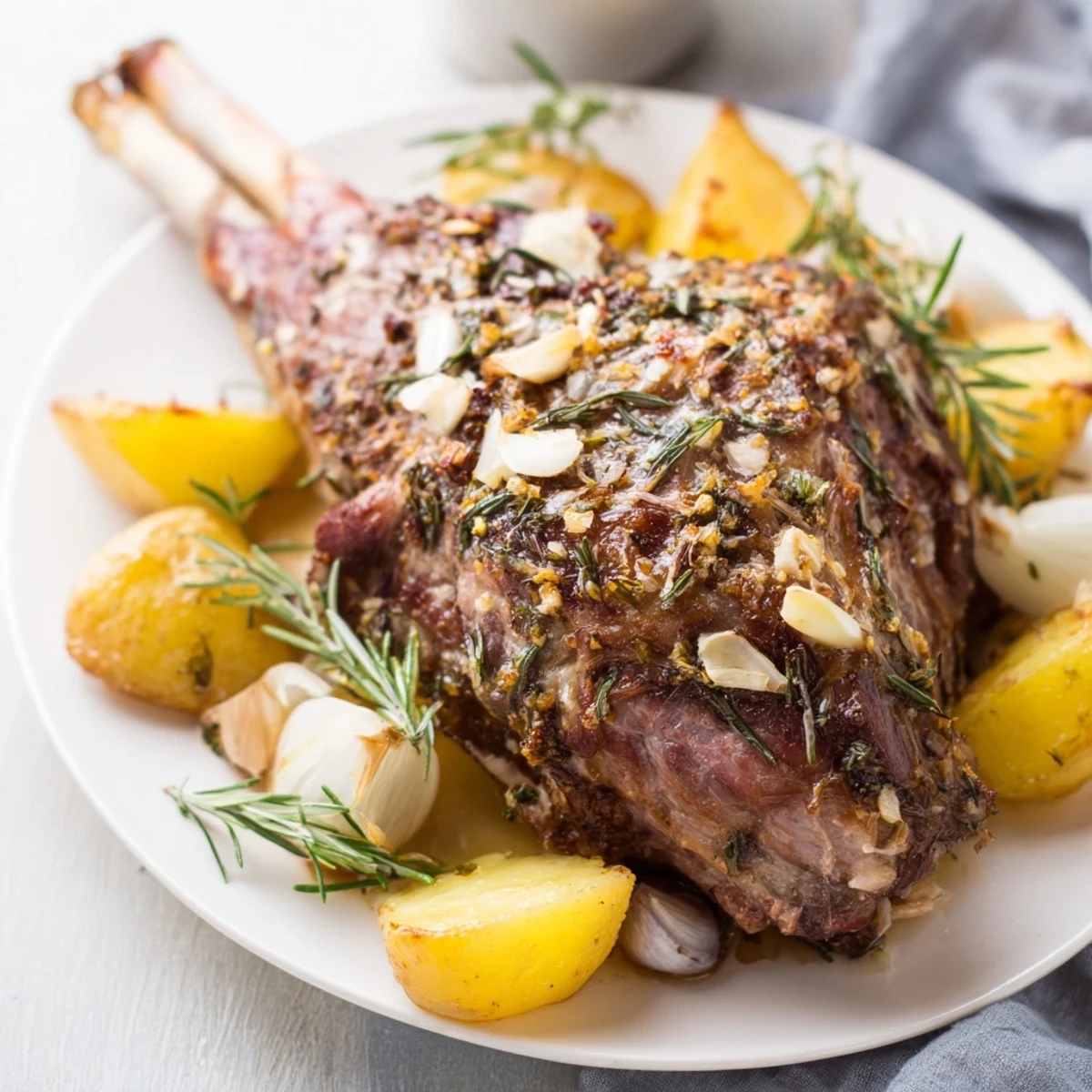 Make small incisions in the lamb to insert sliced garlic, then rub the meat thoroughly with a blend of rosemary, thyme, olive oil, lemon zest, salt, and pepper to infuse deep flavor.