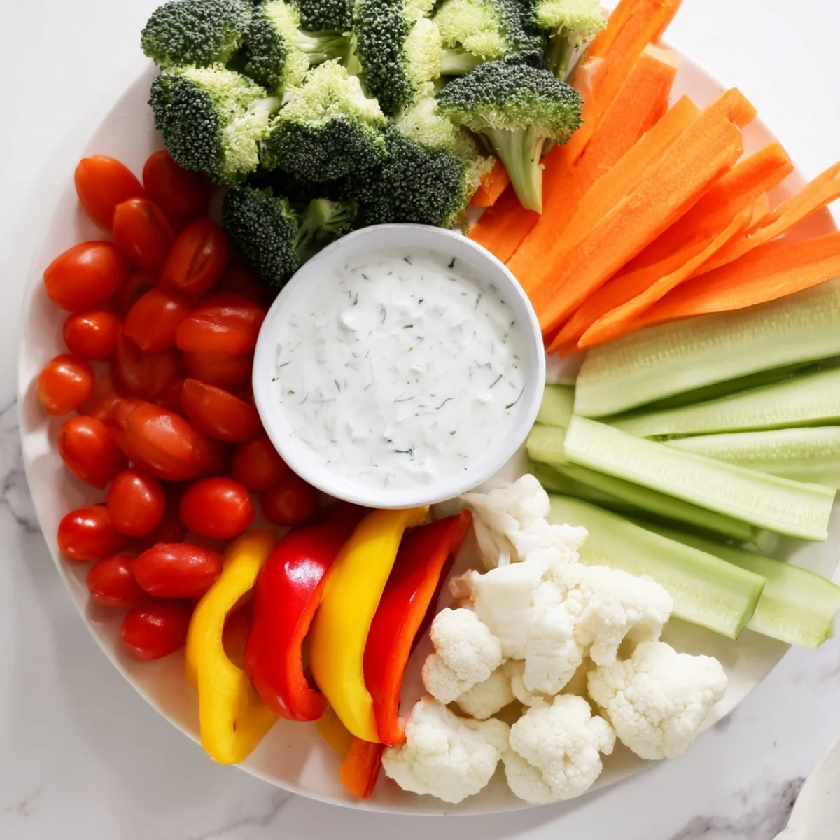 This colorful veggie tray features an array of fresh vegetables including cherry tomatoes, carrots, cucumbers, celery, broccoli, cauliflower, and bell peppers, paired with a creamy ranch dip made from sour cream, mayonnaise, fresh herbs, and spices. The easy-to-prepare dip is mixed smoothly and thinned with milk for perfect consistency. This platter is ideal for entertaining or as a wholesome snack, combining crisp textures and rich flavors in every bite.